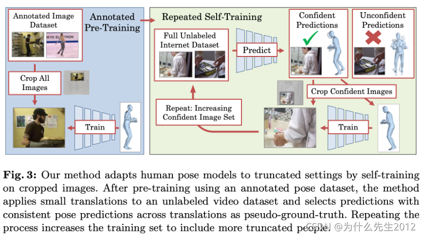 这篇论文提到当图像中的人存在严重裁剪的时候,依然可以通过局部观察来获取整个人全局的姿态,在现实生活中,这种情况往往需要人通过经验或者上下文信息去判断。那么如何让CNN仅仅从一个图像中去学习到这种能力呢?答案就是数据管够,且确保裁剪程度,确定在一定裁剪程度下,CNN依然能够有效学习。另外作者谈到单独通过在训练的时候进行“裁剪”数据增强,在这种针对消费者视频(存在严重的裁剪)的情况下是不够的,而本文认为将裁剪和对自信视频帧进行自我训练可以提供一个不错的结果。对于严重裁剪的图像,输出结果合理即可。(这里的自信视频帧,指的是模型在这个视频帧上能输出一个不错的结果,这个结果还可以作为伪标签)