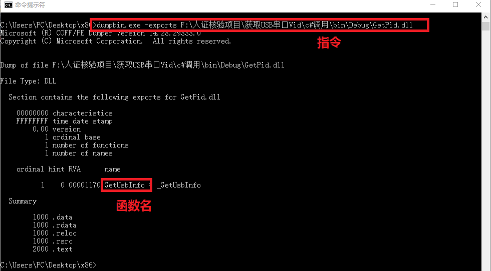 4.编译后的dll名称为GetPid.dll。我们用dumpbin.exe查看一个动态库的接口。