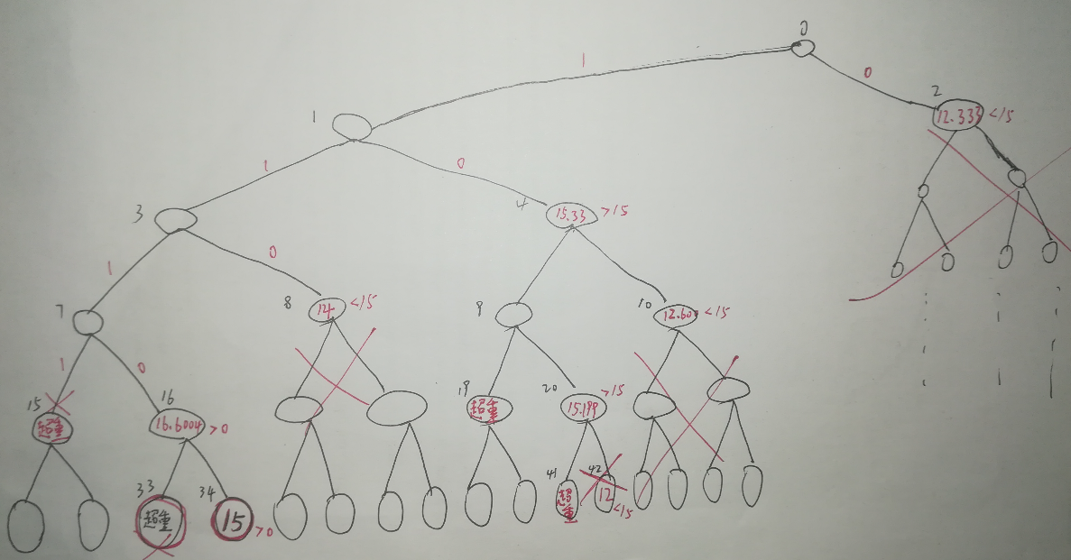 程序的路线图:0-1-3-7结点(选择1,2,3号物品装入背包),当要走15结点时,发现背包超重了,(即4号物品放弃装包) ,此时向右走到16结点。对16结点进行判定:16结点的界是16.6,大于当前界0(初始的界为0),所以可以向右走到16结点,然后遇到1,向左走到33结点,选择5号物品装包,又超重了,故向右有,5号不装包。34结点的界满足要求,可以向右走到34结点,此时已经走到了一个叶结点(34结点),所以将,更新当前界的值(初始时当前界的值设为0),此时当前界的值从0变到了15.