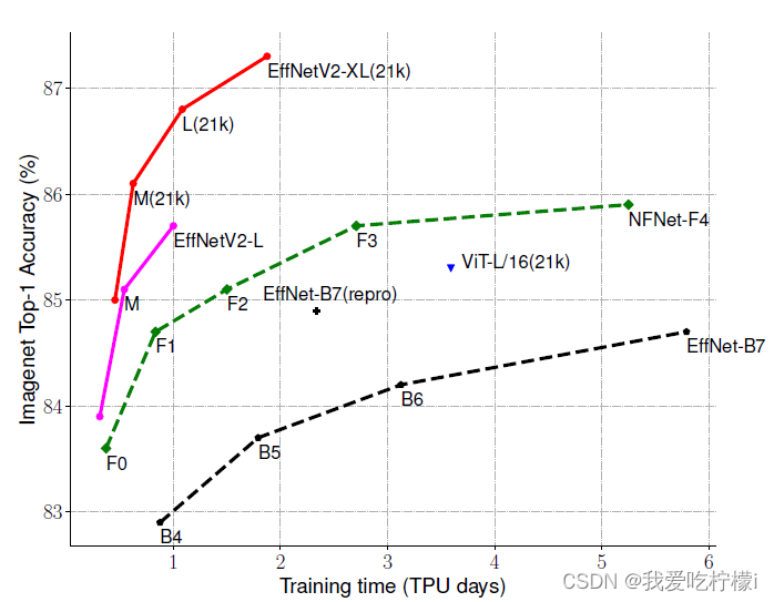 在EfficientNetV1中作者关注的是准确率,参数数量以及FLOPs( 理论计算两小不代表推理速度快),在V2中作者进一步的关注模型的速度