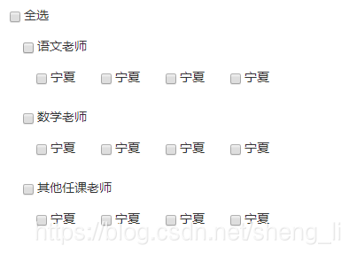 <div class="rules-content"><div><label><input type="checkbox" name="teacherall" id="">全选</label></div><div class="teacher-wrap"><div><label><input type="checkbox" name="subjectTeacherall" id="">语文老师</label></div><ul class="teacher-list clearfix"><li><label><input type="checkbox" name="teacherone" id="">宁夏</label></li><li><label><input type="checkbox" name="teacherone" id="">宁夏</label></li><li><label><input type="checkbox" name="teacherone" id="">宁夏</label></li><li><label><input type="checkbox" name="teacherone" id="">宁夏</label></li></ul></div><div class="teacher-wrap"><div><label><input type="checkbox" name="subjectTeacherall" id="">数学老师</label></div><ul class="teacher-list clearfix"><li><label><input type="checkbox" name="teacherone" id="">宁夏</label></li><li><label><input type="checkbox" name="teacherone" id="">宁夏</label></li><li><label><input type="checkbox" name="teacherone" id="">宁夏</label></li><li><label><input type="checkbox" name="teacherone" id="">宁夏</label></li></ul></div><div class="teacher-wrap"><div><label><input type="checkbox" name="subjectTeacherall" id="">其他任课老师</label></div><ul class="teacher-list clearfix"><li><label><input type="checkbox" name="teacherone" id="">宁夏</label></li><li><label><input type="checkbox" name="teacherone" id="">宁夏</label></li><li><label><input type="checkbox" name="teacherone" id="">宁夏</label></li><li><label><input type="checkbox" name="teacherone" id="">宁夏</label></li></ul></div>