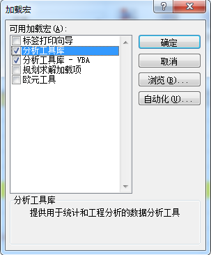 Excel 2010 点击 文件 → 选项 → 加载项 →界面右下角 转到→勾选 数据分析库、数据分析库- VBA后点确定。