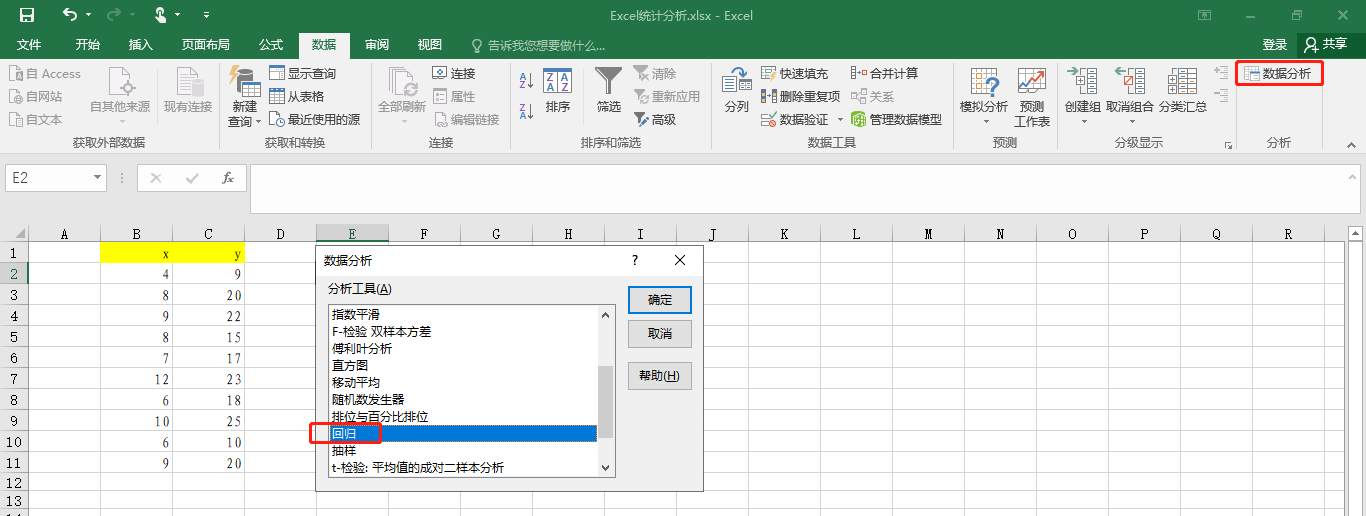 Step3: 点击Excel的数据菜单后再点 数据分析菜单,在弹出来的窗口里选择回归后选择确认。