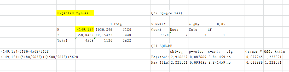 注:纯Excel版可计算p值,但期望值需要自己预先计算好。这里P值等于0.087大于α(0.05),所以接受原假设,即两个分类变量无关。