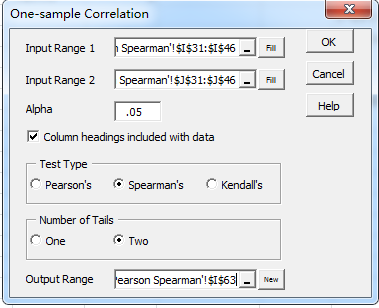 Step2 选择输入区、选择检验类型,这里是Spearman’s,设定输出区域后点确定按钮。