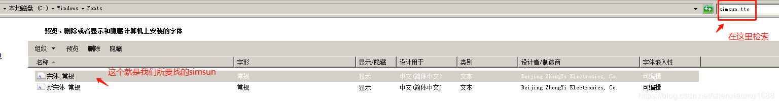 明白的缘由,那么就是把字体补齐。我先到我电脑上把字体找到,windows电脑字体一般位于C:\Windows\Fonts中,由于里边字体太多,我用了快速检索,注意,windows上标示为simsun.ttc,参照下图: