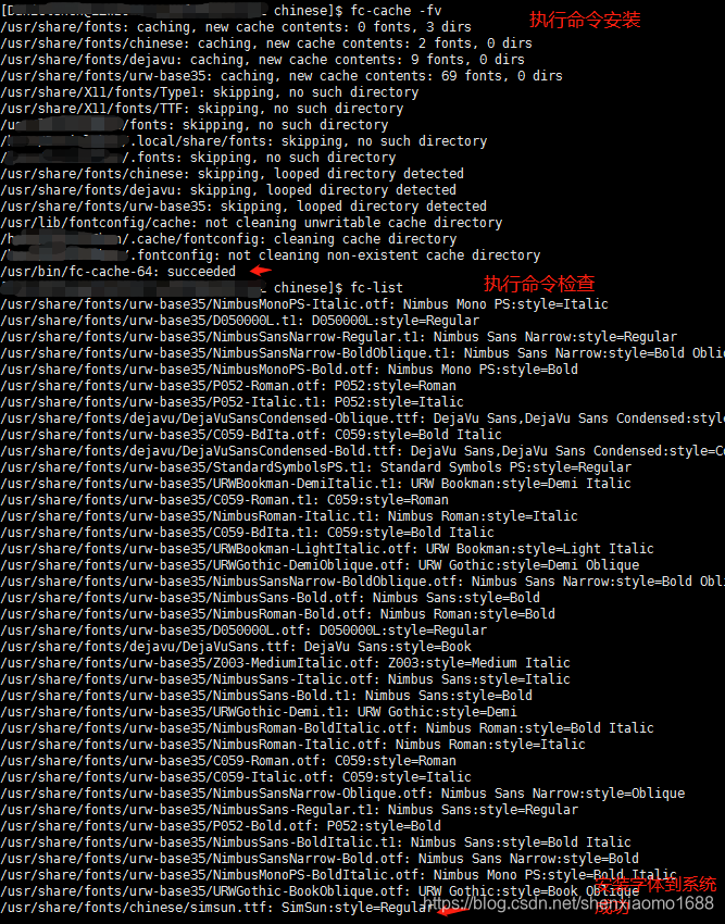在 /usr/share/fonts/chinese 目录下执行 fc-cache -fv,安装字体到系统