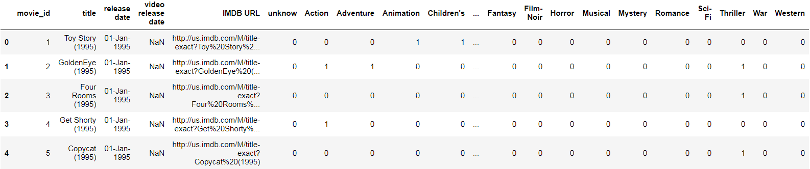 i_cols = ['movie_id', 'title', 'release date', 'video release date', 'IMDB URL', 'unknow', 'Action', 'Adventure', 'Animation', 'Children\'s', 'Comedy', 'Crime', 'Documentary', 'Drama', 'Fantasy', 'Film-Noir', 'Horror', 'Musical', 'Mystery', 'Romance', 'Sci-Fi', 'Thriller', 'War','Western']