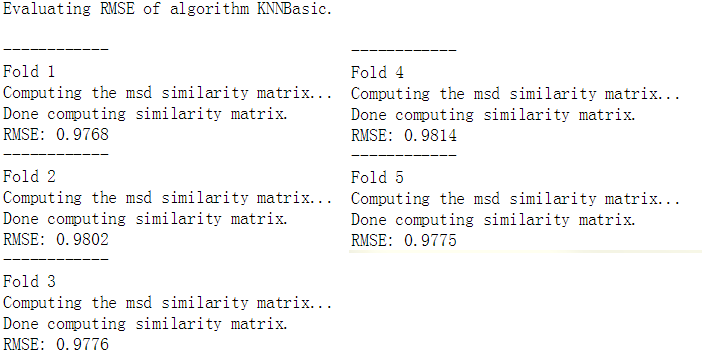 从输出结果中,我们能够看出来。surprise库将所有的评分数据划分为5个文件包,其中4个文件包用于算法训练,第5个文件包用于模型测试。这样的过程重复了5次。
