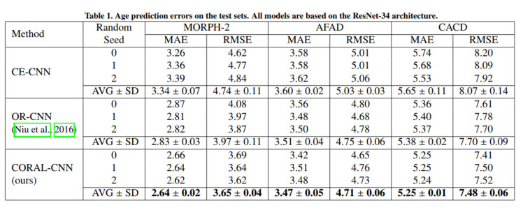 作者对用于年龄估计的三个独立人脸图像数据集(第 4.1 节)进行了一系列实验,以对所提出的 CORAL 方法(CORAL-CNN)与 Niu 等人提出的序数回归方法 (OR-CNN) 进行比较。所有实现都基于 ResNet-34 架构,如第 4.2 节所述,作者将具有交叉熵损失(CE-CNN)的标准 ResNet-34 分类网络作为性能基线。