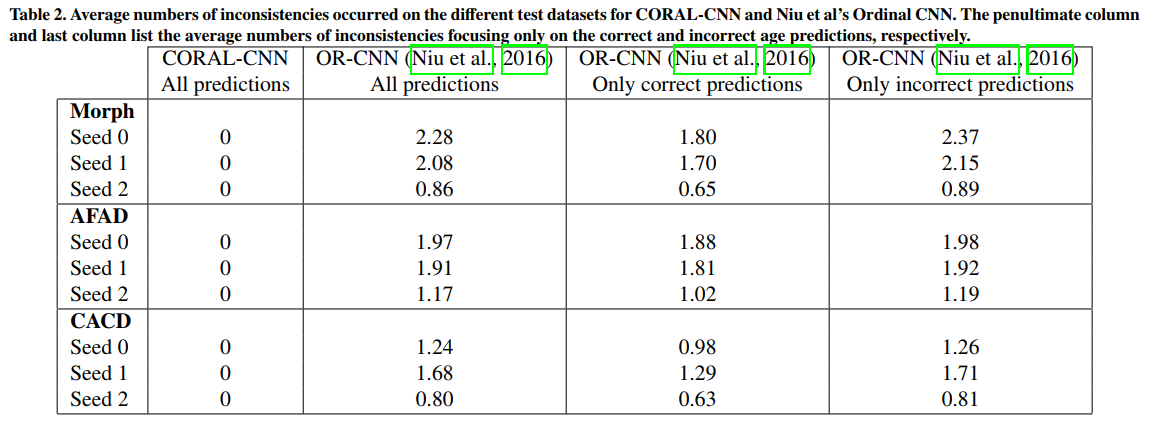 此外,作者使用不同的随机种子进行模型权重初始化和数据集调整,将每个实验重复三次,以确保观察到的 CORAL-CNN 相对于 OR-CNN 的性能改进是可重复的而不是巧合的。作者可以得出结论,通过 CORAL 保证分类器一致性对序数回归 CNN 的预测性能有显着的积极影响(第 5.2 节提供了对 OR-CNN 秩不一致的更详细分析)。