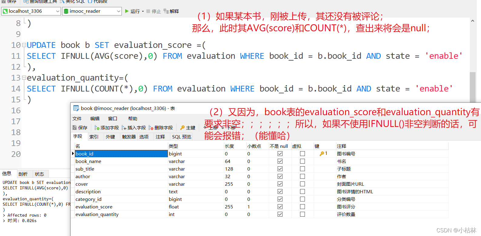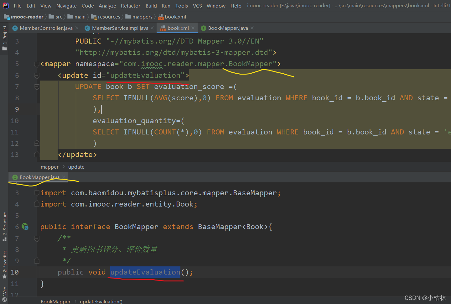 <?xml version="1.0" encoding="UTF-8"?> <!DOCTYPE mapperPUBLIC "-//mybatis.org//DTD Mapper 3.0//EN""http://mybatis.org/dtd/mybatis-3-mapper.dtd"> <mapper namespace="com.imooc.reader.mapper.BookMapper"><update id="updateEvaluation">UPDATE book b SET evaluation_score =(SELECT IFNULL(AVG(score),0) FROM evaluation WHERE book_id = b.book_id AND state = 'enable'),evaluation_quantity=(SELECT IFNULL(COUNT(*),0) FROM evaluation WHERE book_id = b.book_id AND state = 'enable')</update> </mapper>说明: