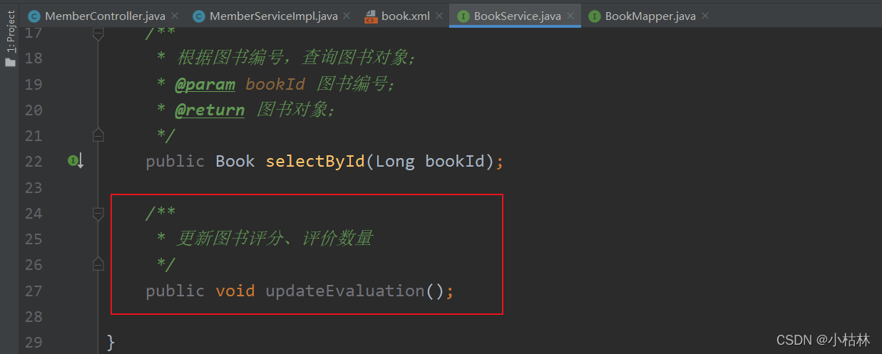 4.在BookService接口中,定义【更新评分、评价人数】的方法:updateEvaluation()方法;(PS:Service中的可以起其他名字,无需和Mapper中的保持一致)