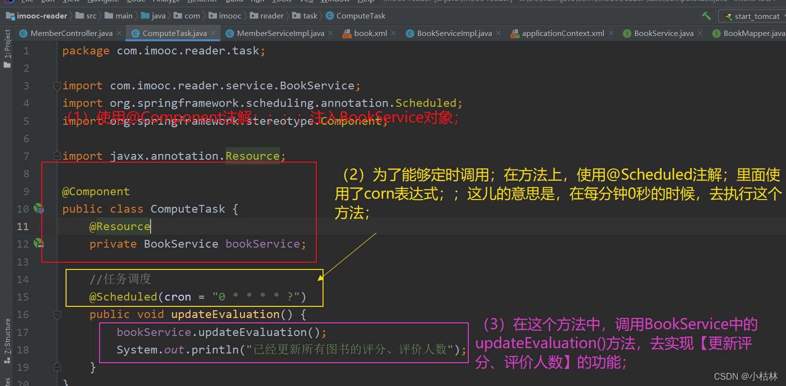 package com.imooc.reader.task;import com.imooc.reader.service.BookService; import org.springframework.scheduling.annotation.Scheduled; import org.springframework.stereotype.Component;import javax.annotation.Resource;@Component public class ComputeTask {@Resourceprivate BookService bookService;//任务调度@Scheduled(cron = "0 * * * * ?")public void updateEvaluation() {bookService.updateEvaluation();System.out.println("已经更新所有图书的评分、评价人数");} }说明: