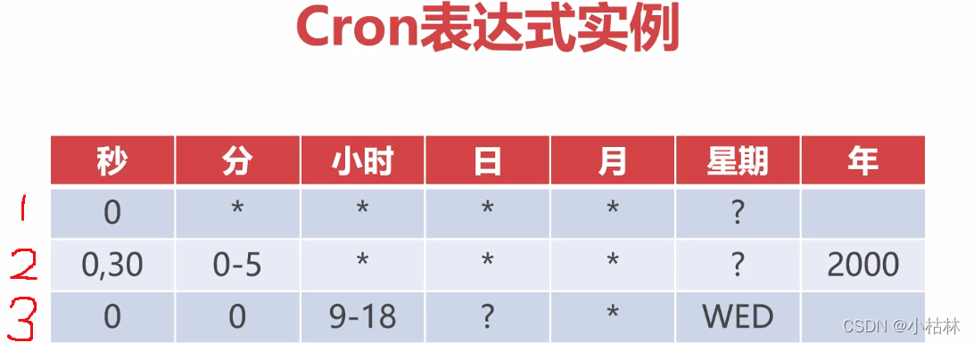(3)其中,第7位年,可以省略;日和星期是互斥的,即,写了日,星期就只能是?;写了星期,日就只能是?;(如果星期哪儿是?,就表示忽略星期)