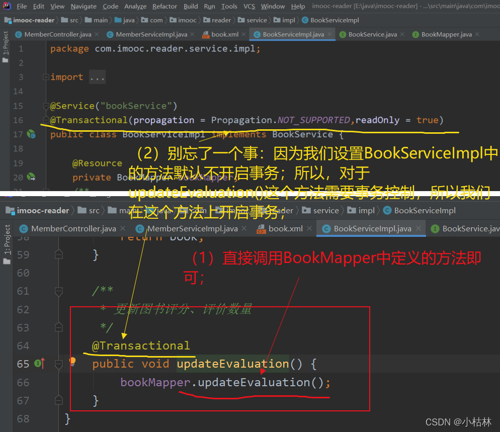 5.在BookServiceImpl实现类中,去实现【更新评分、评价人数】的方法:updateEvaluation()方法;