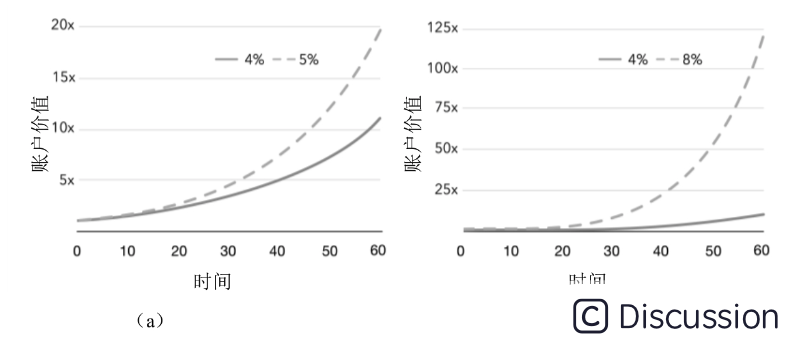 从以上两条对比的复利曲线可以看出,复利是一条指数增长曲线,前期看着会比较慢,但后面的增长速度是非常快的。复利开始的越早,就会越早进入高速增长区。即使利率差比较小,经过漫长的时间之后收益也会产生巨大的差异。
