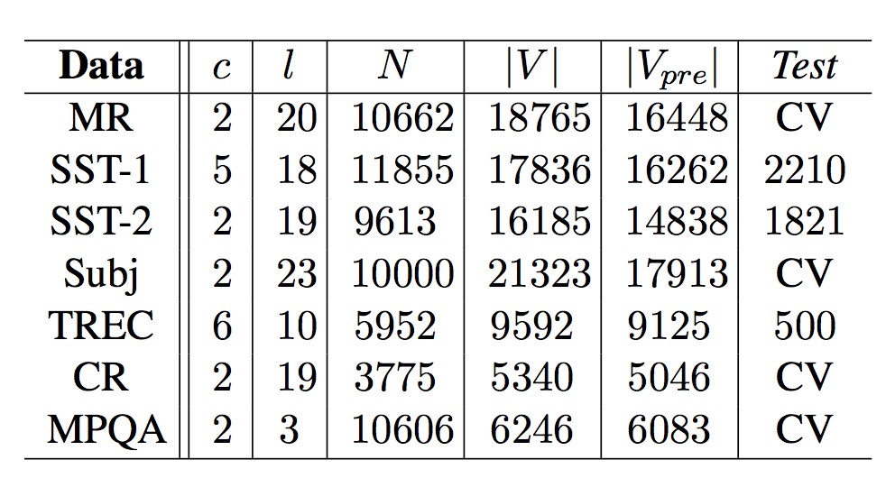 本文的目的是对CNN的结果进行很少的改动就能够使其在静态和task-specific的vector上都能够使用。这里讨论的CNN,在7个任务中有4个比以往的结果表现的要好,包括情感分析和问题分类。