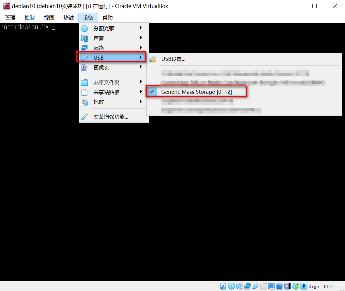 2.启动debian10虚拟机,点击设备->USB->把U盘的名字勾选