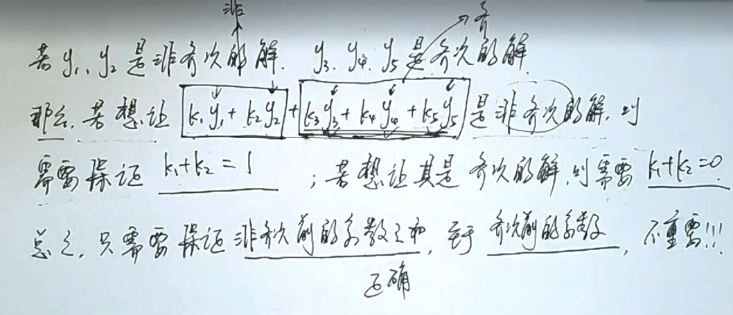 - 任意常数个数和阶数相同-->非齐次前的系数之和满足1(非齐次)或0(齐次)-->解的组合是非齐次或齐次的解