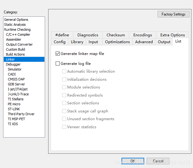 AR的默认设置是不生成map文件的,我们需要手动设置一下,如下图,然后点击准备就绪之后编译即可在PROJDIR\FLASH_256KB_PFLASH\List文件夹下找到: