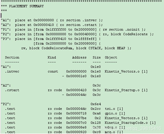 1)PLACEMENTSUMMARY,该部分主要显示目标代码在芯片内部的存储器映射地址,可能会有人疑问为什么会分配到这些地址的呢,其实这些地址分配都是在前文讲的Linker文件(*.icf文件)里预定义好了,IAR根据所选目标芯片就按照该定义分配地址段,然后烧写进Flash