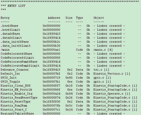 (2)ENTRYLIST,开发工程内所有函数的入口地址,个人觉着这部分很有用,通过该地址映射再结合调试的时候观察内存空间可以方便整个工程执行情况,让你了若指掌,而且也方便你解读一个陌生程序的功能(例如参考别人的例程,网上的例程之类的),总之个人觉着这个部分用处很大,有心人可以在此处做很大文章。