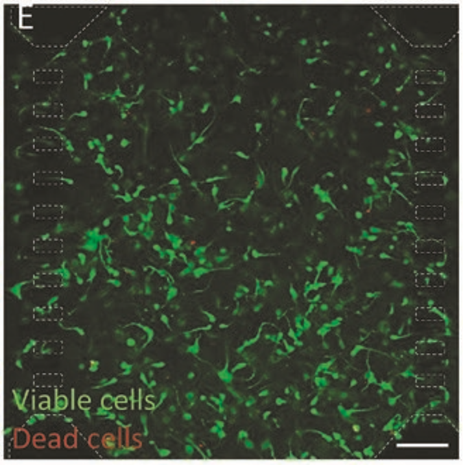 图2 在9天后,U-251细胞在微流控芯片中的存活显示,活细胞(用1μg/ml的钙素标记)显示为绿色,死细胞显示为红色(用4μg/ml的碘化丙啶标记)。白色虚线划定了微型装置柱(50x100 µm)。细胞在1.5mg/ml胶原水凝胶内以400万细胞/ml的速度培养