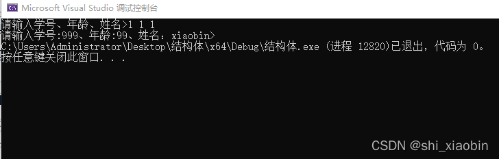 {//输入输出Student fire = { 0 };//输入printf("请输入学号、年龄、姓名>");scanf("%d %d %s", &fire.id, &fire.age, fire.name);//重新赋值...fire.id = 0;fire.age = 22;strcpy(fire.name, "小斌");//整体清零memset(&fire, 0, sizeof(Student));//整体对结构体赋值fire = (Student){999,"xiaobin",99 };printf("请输入学号:%d、年龄:%d、姓名:%s>",fire.id,fire.age,fire.name);return 0;