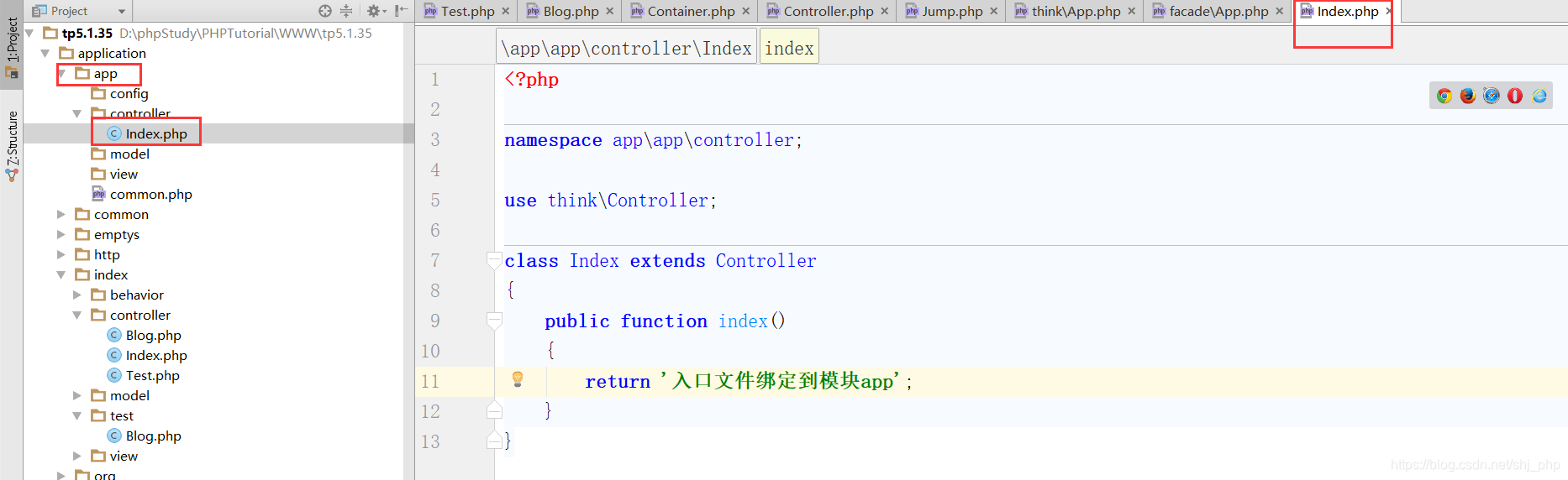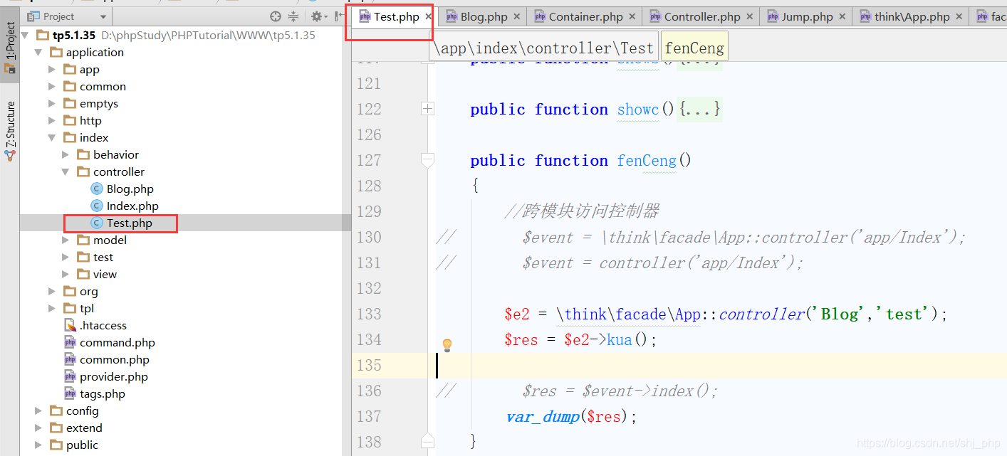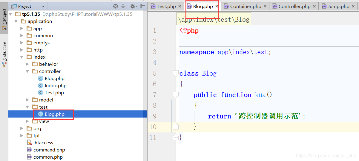 // $event = controller('app/Index');//方法2:不跨模块调用别的目录下的类的方法$e2 = \think\facade\App::controller('Blog','test');//使用助手函数更简单$e2 = controller('Blog','test');$res = $e2->kua();// $res = $event->index();var_dump($res);}