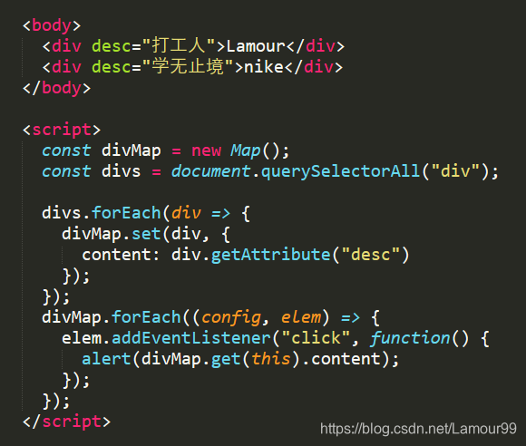 map的key可以为任意类型,下面使用DOM节点做为键来记录数据。