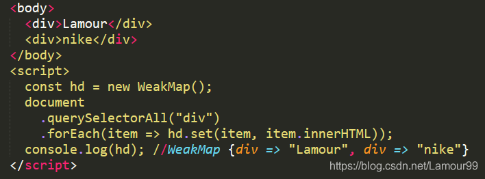 下例当hd删除时内存即清除,因为WeakMap是弱引用不会产生引用计数