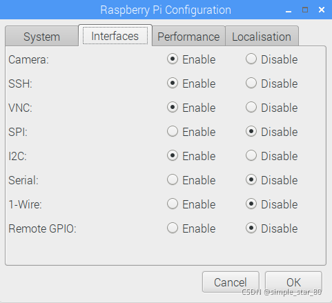 Rpi是通过I2C接口与HAT通信的,因此,需要在Respbian中的配置选项中打开 I2C 使能开关。