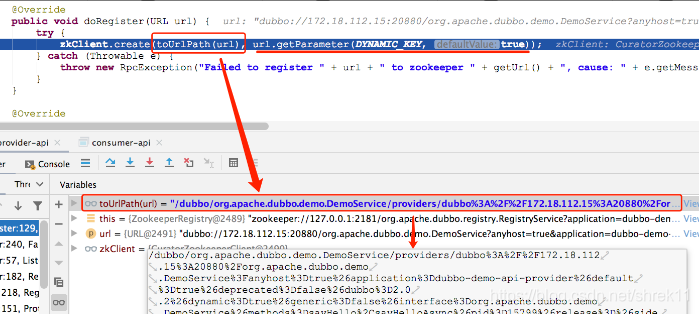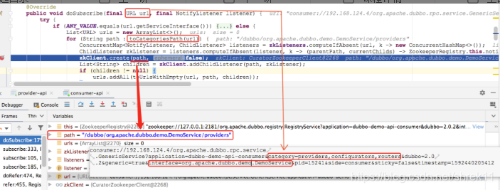 我们来看 ZookeeperRegistry 这个实现类,它是由上面的 ZookeeperRegistryFactory 工厂类创建的 Registry 接口实现,其中的 doSubscribe() 方法是订阅操作的核心实现,在第 175 行打一个断点,并 Debug 启动 Demo 中 Consumer,会得到下图所示的内容: