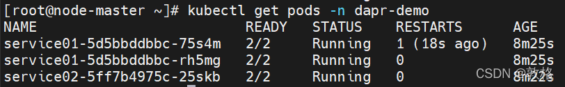 spec:replicas: 2selector:matchLabels:app: service01template:metadata:labels:app: service01annotations:dapr.io/enabled: "true"dapr.io/app-id: "service01"dapr.io/app-port: "80"dapr.io/sidecar-liveness-probe-delay-seconds: "10"dapr.io/sidecar-readiness-probe-delay-seconds: "10"dapr.io/log-as-json: "true"spec:containers:- name: service01image: docker.io/k8schina/service01:v1ports:- containerPort: 80imagePullPolicy: Always