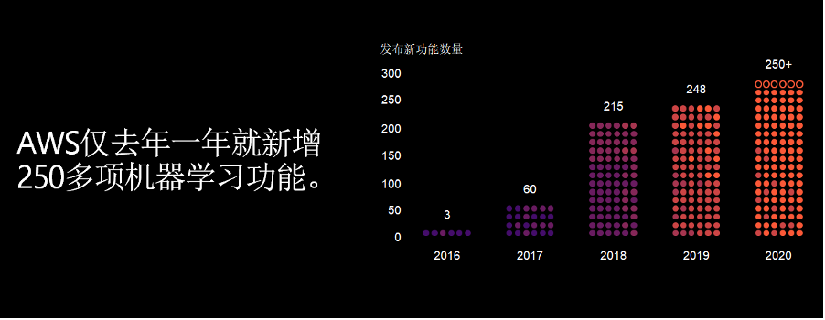 值得一提的是,机器学习也是今年re:Invent大会的“主角”之一。事实上,AWS利用机器学习技术已经有20多年时间,并在2016年开始发力,在云上提供机器学习服务。当年仅发布了三个服务,2017年开始加速,最近三年,每年新增的服务和功能超过200个,可以说真正为全球AI的开发者丰富了他们急需的工具集。