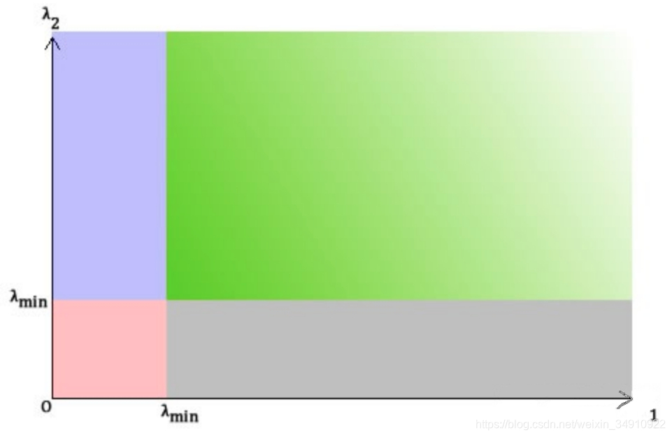 和Harris一样,如果该分数大于设定的阈值,我们就认为它是一个角点。我们可以把它绘制到λ1~λ2空间中,就会得到下图:
