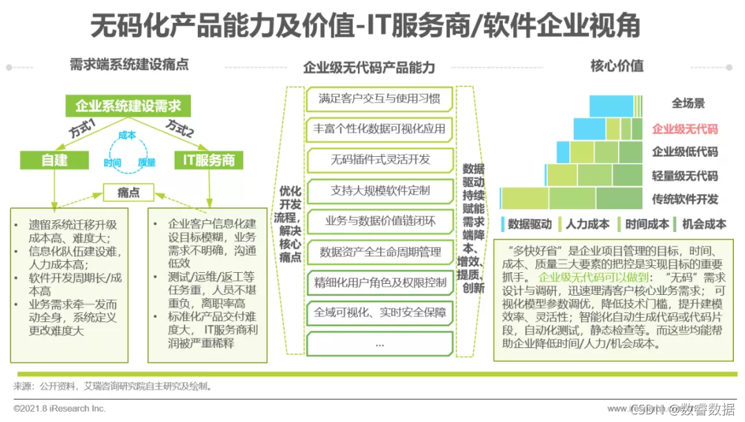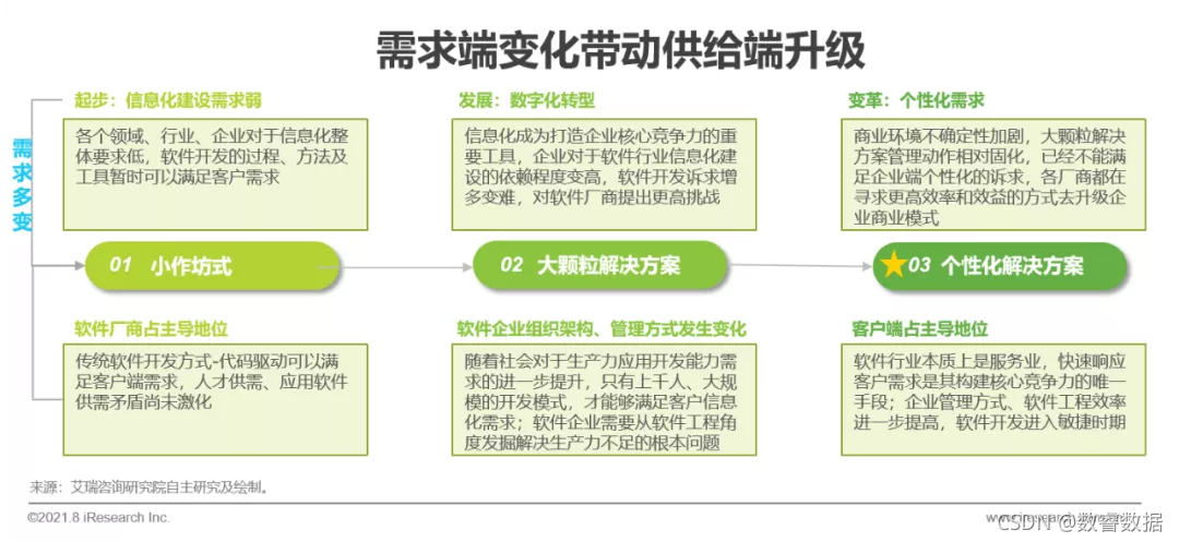 核心摘要:近年来,企业信息化建设需求与底层技术发生翻天覆地的变化,传统软件开发模式已无法快速响应复杂多变的企业业务诉求,而IT人才贵、易流失,传统信息化建设低质低效,缺乏创新能力等问题始终辖制着软件产业的创新发展。聚焦软件开发模式变革,数睿数据联合艾瑞发布《定义软件开发新模式-2021年中国企业级无代码白皮书》,共同探讨中国软件产业变化及企业应对之策。