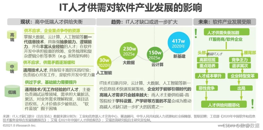 “软件蓝领”概念最早诞生于软件工程“手工作坊时期”,是大众针对软件行业快速规模化发展与IT人才供需的严重失衡的痛点所提出的,旨在借助工业化、流水线经验,利用高低端IT人才权责分离的方式,最大程度提高软件生产效率。现在,这种方式反而成为激化矛盾的导火索:①IT人才愈发昂贵:企业对高端IT人才依赖性高,无奈于我国高低端IT人才供需不平衡现状,软件企业倾向加大薪酬福利筹码吸引高端人才,人才成本攀升;②IT人才流失率变高:为了留住高端人才,企业资源严重倾向高端IT人才,中低端人才只能做重复性、低技术含量的开发工作。低薪、技术能力难以提升、职业发展天花板、与业务人员沟通滞后导致的返工都会致使低端IT人才的消极怠工、离职跳槽。长此以往,软件产业发展或陷入死循环,发展严重受限。