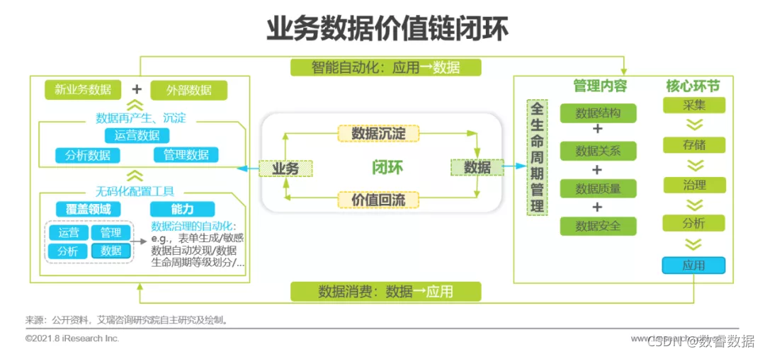 数据在企业中存在的形态是琐碎多样且无体系的,不仅包括源自互联网、物联网等外部数据,还包括由企业日常运营活动产生的“旧”数据,以及系统建设、配置应用时所产生的“新数据”。只有将内外部数据进行统一全生命周期管理,形成优质数据资产,再回归到应用中去,利用起来,才能让数据源源不断地产生价值,赋能经营。业务与数据闭环推动数据治理的思维从以业务侧为中心→以数据为中心:每个字段都有固有属性,表有可能自动发现异常敏感数据;再结合领域专家经验(比如建立数据质控规则)、知识图谱(比如应用到数据模型管理、元数据管理、数据质量管理、数据安全管理等),实现字段级的数据治理自动化,从而解决现有数据不规范、质量低;系统建设各自为战、数据孤岛;数据治理缺乏体系方法、治理周期长等多重问题。