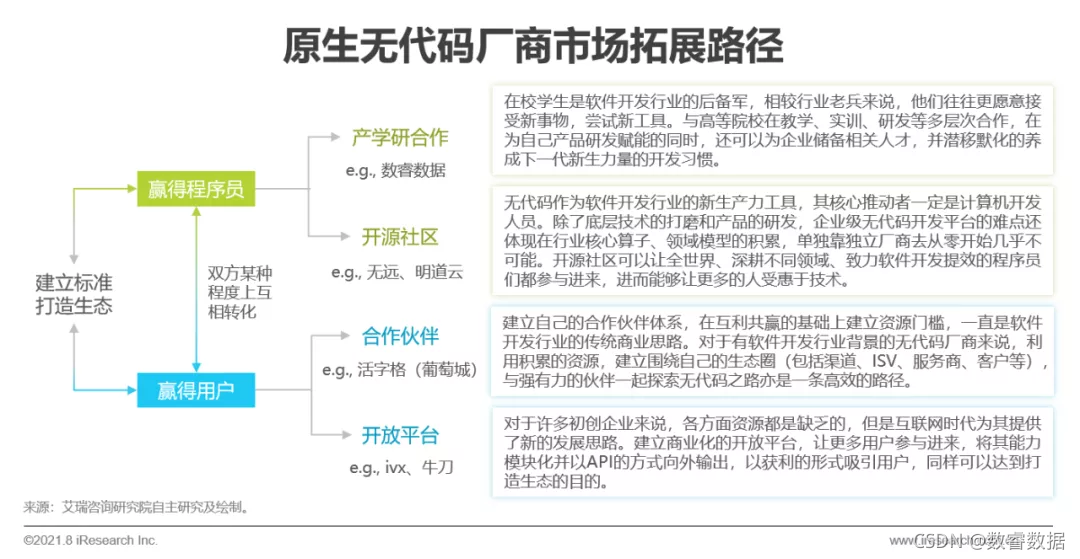 对于软件厂商、IT服务商、互联网大厂和行业头部企业来说,推出自己的无代码开发平台会有更复杂的目的和更多元的市场策略,本报告不再重点讨论。但对于现阶段的原生无代码厂商而言,“建立标准、打造生态”必然是其寻求长期发展的下一步核心目标。企业级无代码是软件开发行业的下一代生产力工具,产业发展现阶段还处于孕育期。厂商竞争首先在产品层面需通过“数据驱动、数用一体”满足通用性要求,其次还需通过一定的商业策略赢得程序员(使用者)和用户(付费者)。观察当今市场,原生无代码玩家主要拓展路径有“开源社区、产学研合作、合作伙伴体系、开放平台”四种。