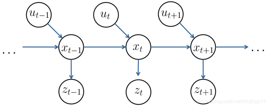 马尔科夫链:使用有向图表示 x_t 状态(如相机位姿)、u_t 运动控制量、z_t 观测值(如图像像素值)的之间的关系的链式图。