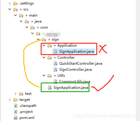 主要是因为application类的路径放错位置了,正确的位置应该放在项目下面,错误的位置是在项目下面建立一个package,然后放在packgae中了,如下图所示,正确的位置是绿色框所示,错误的位置是红色框所示: