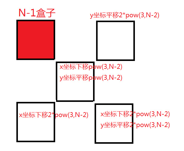 由浅入深,1级盒子宽度1,2级盒子宽度3,3级盒子宽度9,可得N级盒子宽度pow(3,N-1)。