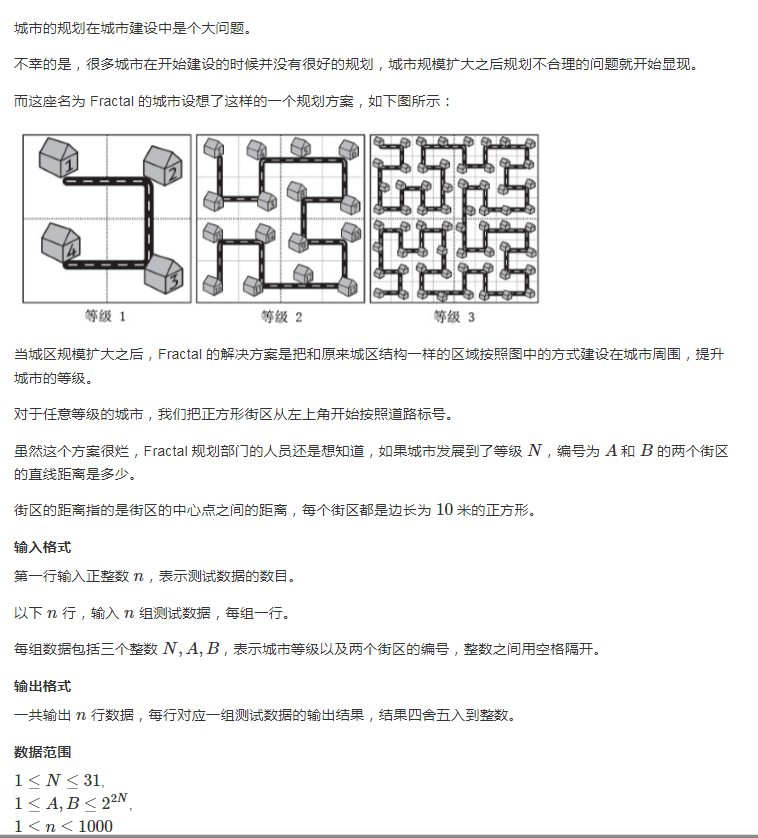 {ios::sync_with_stdio(0),cin.tie(0);ll i,j,n,t,a,b;cin>>t;while(t--){cin>>n>>a>>b;pair<ll,ll>p1,p2;p1=calc(n,a),p2=calc(n,b);int a1=p1.first,b1=p1.second,a2=p2.first,b2=p2.second;//cout<<a1<<' '<<b1<<' '<<a2<<' '<<b2<<endl;cout<<(ll)(10*sqrt(1.0*(a1-a2)*(a1-a2)+1.0*(b1-b2)*(b1-b2))+0.5)<<endl;} /**< +0.5作用是四舍五入 */return 0;