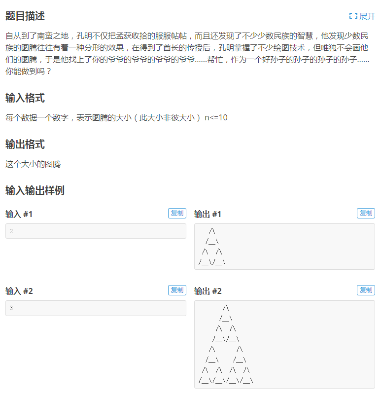 ///__\/__\for(i=x+1;i<=2*x;i++) //先把f(n-1)的图形复制到下面,如上for(j=1;j<=y;j++)a[i][j]=a[i][j+y]=a[i-x][j];for(i=1;i<=x;i++) //最上面那个f(n-1)平移y/2个单位for(j=y;j>=1;j--)a[i][j+y/2]=a[i][j],a[i][j]=' ';
