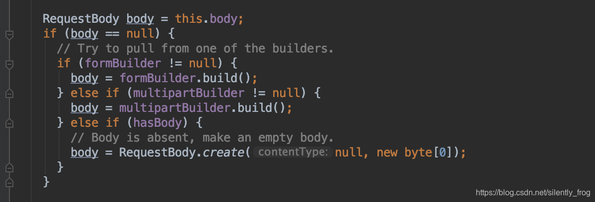 如果使用了@FormUrlEncoded,则formBuilder会被创建;使用了@Multipart,multipartBuilder会被创建。