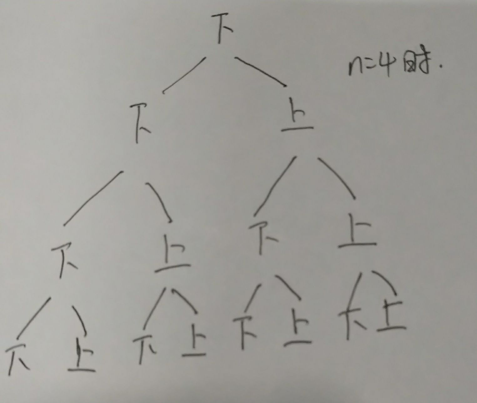 在此输出顺序是down up 所以在输出时要判断down还是up 显然左结点是down 右结点是up 即可以在递归传入左右节点的时候代入参数值 down或者up ,另外递归的终止条件,显然是递归到第N层,完成输出 因此需要一个参数记录当前层数 以及折纸次数N