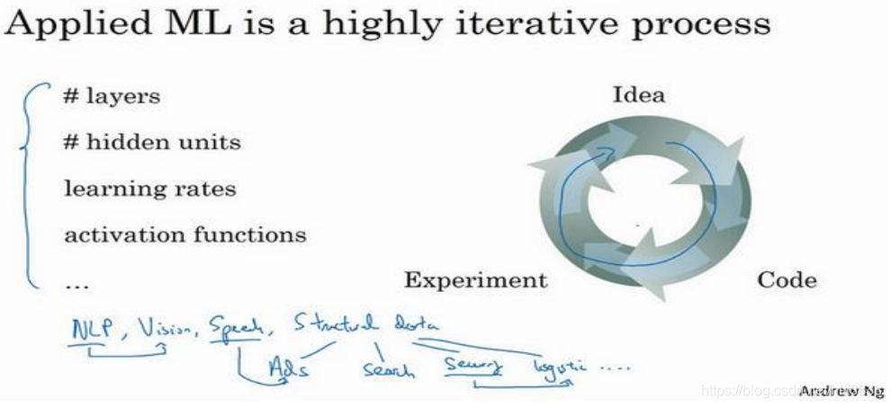在配置训练、验证和测试数据集的过程中做出正确决策会在很大程度上帮助大家创建高效的神经网络。训练神经网络时,我们需要做出很多决策,例如: 神经网络分多少层;每层含有多少个隐藏单元;学习速率是多少;各层采用哪些激活函数。