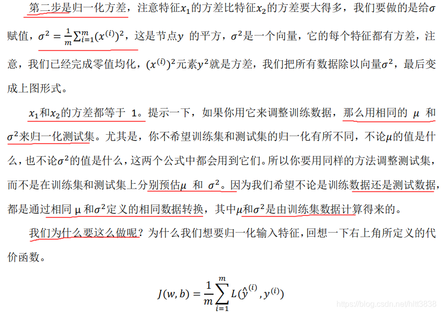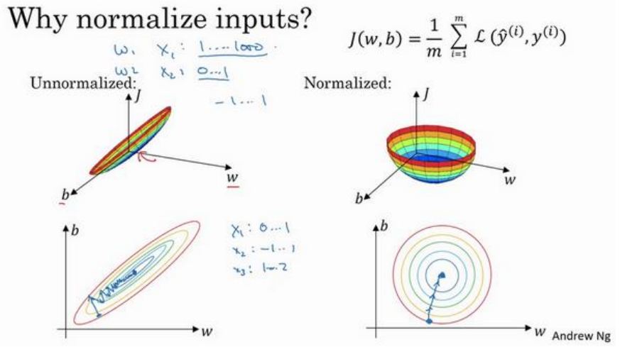 当它们在非常不同的取值范围内,如其中一个从 1 到 1000 ,另一个从 0 到 1 ,这对优化算法非常不利。但是仅将它们设置为均化零值,假设方差为 1 ,就像上一张幻灯片里设定的那样,确保所有特征都在相似范围内,通常可以帮助学习算法运行得更快。